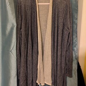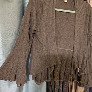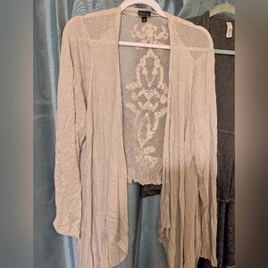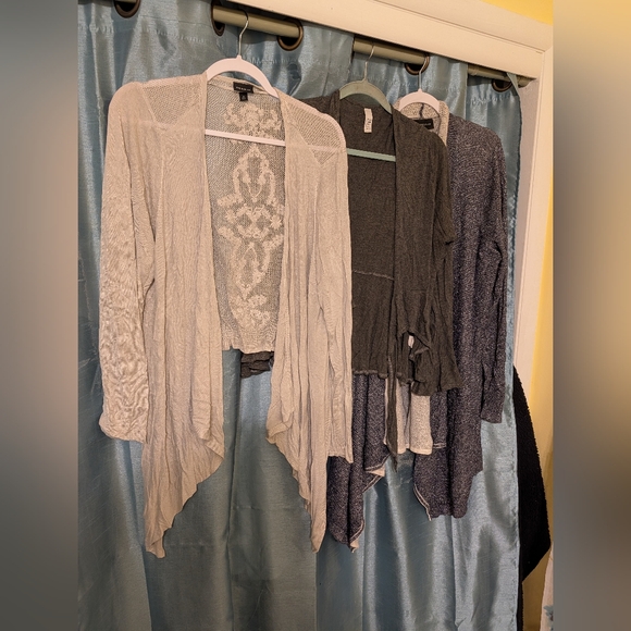 Three cardigans: light grey is from torrid, size 2; dark grey is from Jolie, 2x; sparkly blue is from Lane Bryant. No size tag on it but fits a 2x-3x.