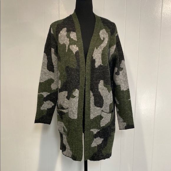 Keywords: camo cardigan, open front, cabincore, cottagecore, modern canvas, military green, oversized fit, cozy knit, pockets, trendy, fall fashion, layering piece, boho chic, earthy tones, soft knit, relaxed style, contemporary, outdoorsy streetwear, cozy layering trend