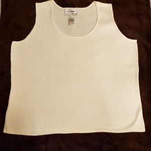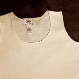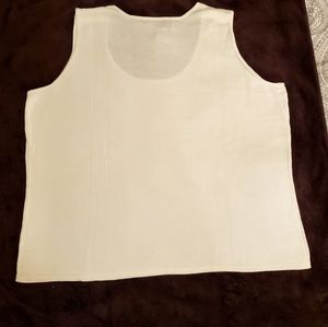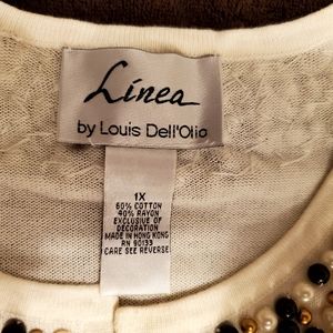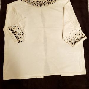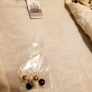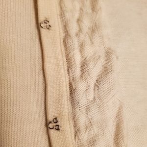 Beaded cardigan with a matching shell. A creamy, off-white knit with gold, black, and pearl beads. Cardigan closes with hook and eye fasteners.