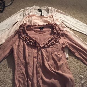 White cream color with ruffles around collar. Basic light pink cardigan. Coffee color with ruffles around collar.