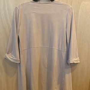 Lightweight faux suede cardigan/ jacket. More of a light pink hue to it than the pictures show. Very soft , good quality! 3/4 sleeves