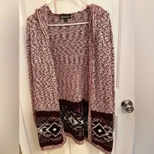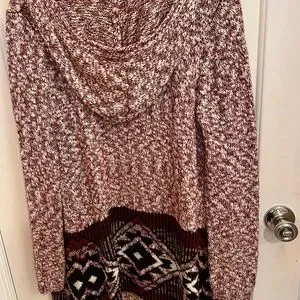 Aztec design hooded cardigan sweater. Comes to mid thigh. Size M. 100% acrylic. Machine wash. Dry flat.