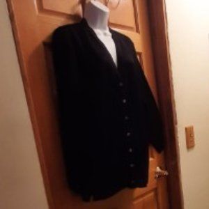 Black cardigan button-down sweater with two pockets. Uniform like styling.