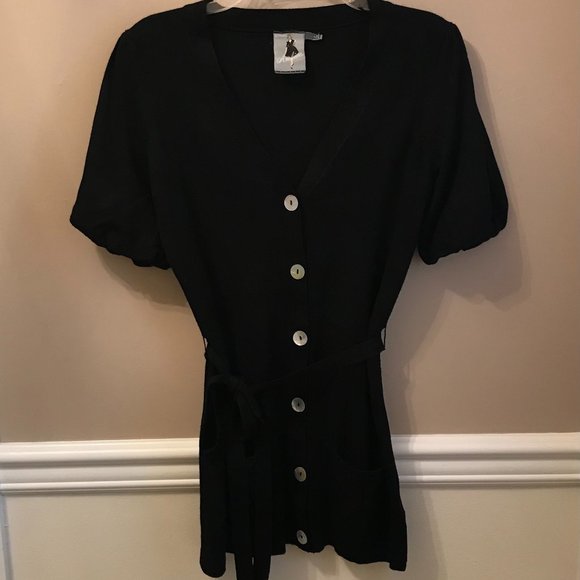 Cardigan sweater from Esther's Archive in color solid black, size small. Elegant, dressy, V neck top features elasticized short sleeves, 6 luminescent buttons, a tie belt, and two front pockets. Made of a soft viscose/nylon blend that can be machine washed. Like new.