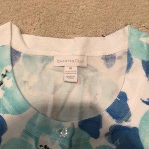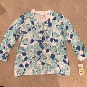 Sequin-embellished turquoise and blue floral cardigan with clear buttons. Never worn, with tags, size medium.