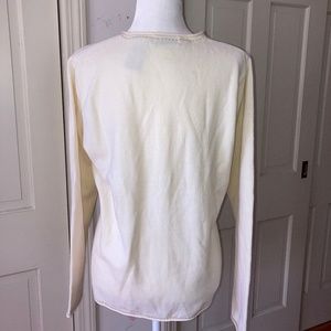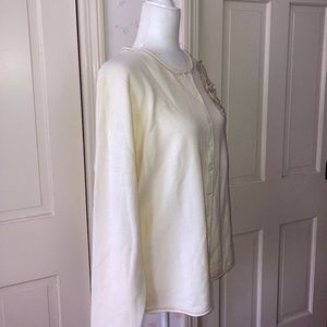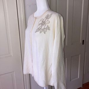 Color is Fresh Ivory with tan stitching around the neck, sleeves, and front/back of the hem.Ten white buttons. There is a large flower with fabric petals, sequins and tiny beads resembling pearls. 88% Acrylic, 11% Nylon, and 1 % Spandex . SIZE Large 12/14 . Never Worn
