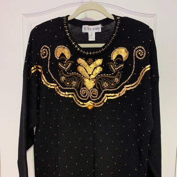 Cardigan with beads and sequins is 45% cotton & 53% rame. Length on the back is 29 inches
