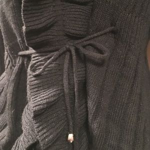 Cardigan, with tags, with tie belt, ruffle neck and ruffle on bottom of sleeves. REPOSHING