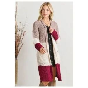 A gorgeous popcorn textured cardigan, and color block wine/tan/cream. Open front.