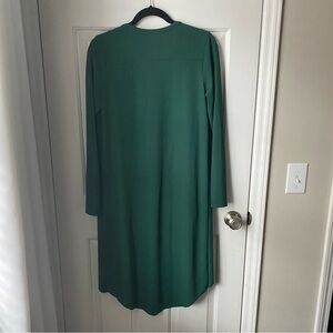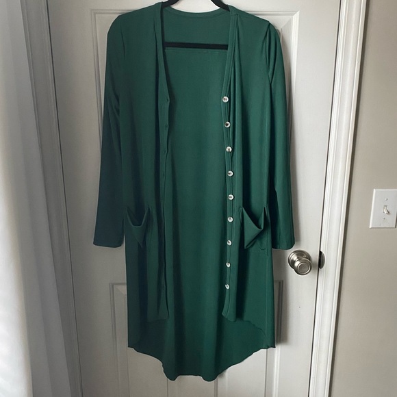 Green duster. MIDI length. Slight tapered from front to back,