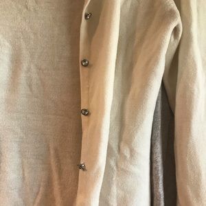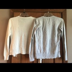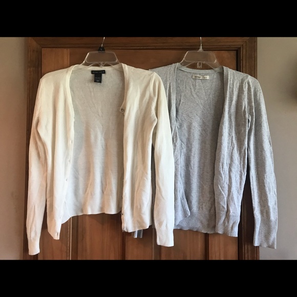 Worn and washed. No stains, holes, or rips. Smoke free home. Grey is Old Navy Brand size small. Cream is New York and Company size xsmall and buttons are a studded button.