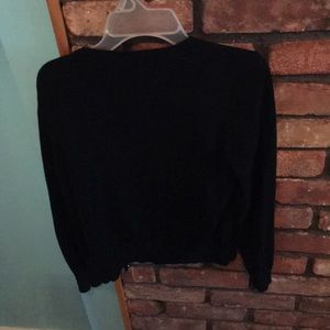 Black cardigan/sweater by banana republic. It is a light cardigan with beautiful black buttons that look like black marble at the top. Not itchy material and is quite soft especially my skin is SUPER sensitive and when I wear this no itch or redness at all. 👍🏽