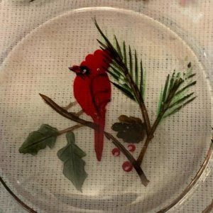 Cardinal & Holly on a Clear Glass Dish with Red Ri