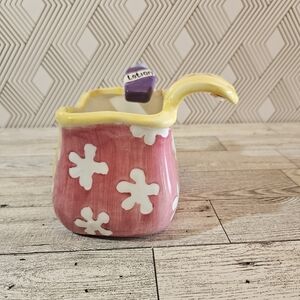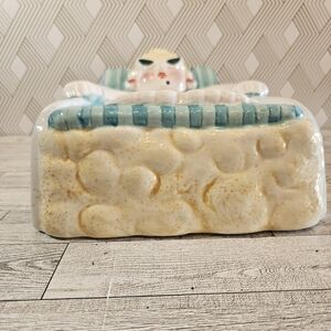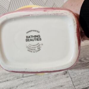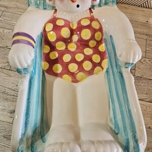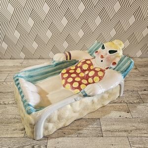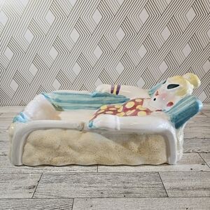 The most adorable Chip and Dip set! This lovely lady sunbathing in her beach chair holds the chips and her little beach bag holds the dip. This piece is from the 90's and pretty rare to find both pieces in such great condition. No chips or cracks except for one little chip on the glaze on the underside of the beach bag where it hangs on the edge of the chip bowl (shown in last photo).