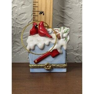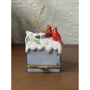 The Cardinal Mailbox Porcelain Hinged Surprise Gift Trinket Box Christmas Ornament is a small, modern-style ornament designed with two cardinals on a mailbox trinket box. Hand-painted in a beautiful blue color, this limited edition collectible is perfect for anyone . The hinged trinket box features intricate details and is artist-designed, making it a charming addition to any holiday and seasonal décor. This unique ornament is a perfect gift for collectors or those who appreciate cardinals and decorative items.