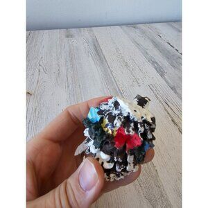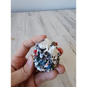 larger acorn nest is about 5 in tall by 3 in, Cardinal with pear is about 5 in by 3 in, baby Cardinals and acorn are about 2.5 in x 2 in by 2 in, comes as a set, the pair did have some cracks and wear on it and a chip on the back otherwise no their problems