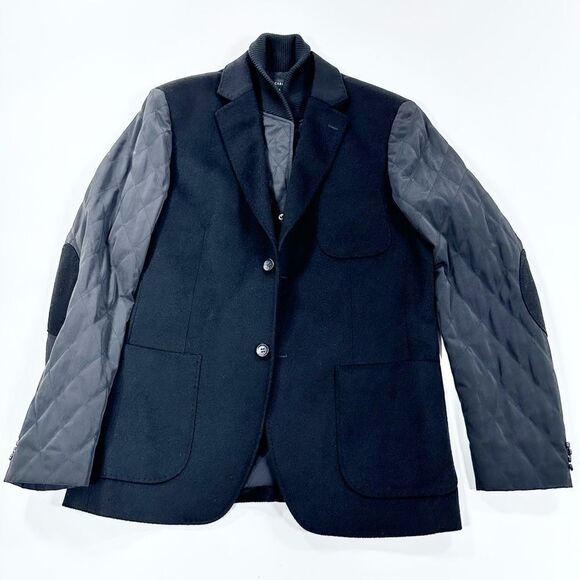 Cardinal of Canada black double layer cashmere wool sport coat M. Quilted sleeves in a different fabric. Unstructured design, stylish mock collar.
