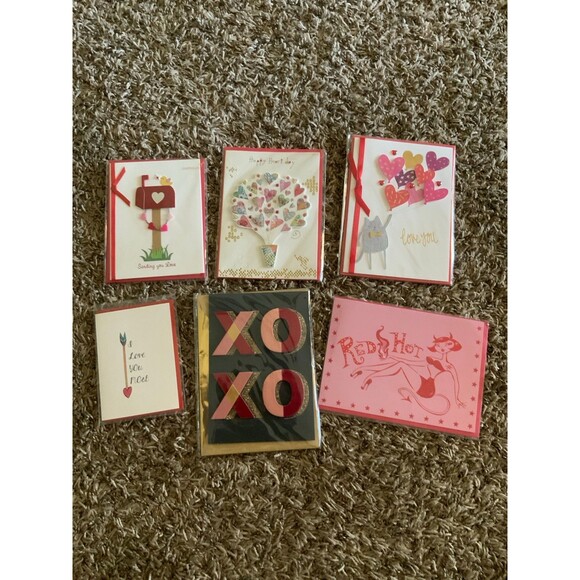 Valentines Day card bundle. 3 Papyrus, 1 American greetings, 1 Alabama brown, 1 Fluff Shop. 5 out of 6 are unopened, all are unused