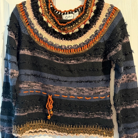 Carducci Vibrant sweater with unique textures. Features a mix of colors and patterns. Ideal for adding flair to your wardrobe. Gently used.