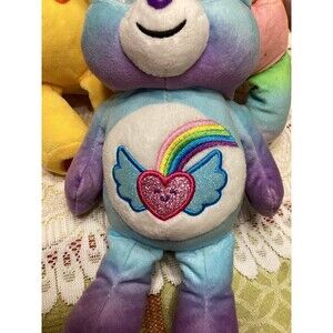 Three plush Care Bears and one small plastic jointed bear. The plush are all about 9 inches tall. The bear with the heart on her tummy is Togetherness Bear. The blueish bear with the rainbow and heart on his tummy is Dream Bright Believe in Yourself Bear. The bright yellow boy is Funshine Bear. All the plush are in very good condition. Their tush tags have been cut off. The little plastic bear is 2.5 inches and his arms move. She is TCFC Just Play Glitter Rainbow tummy Cheer Bear.