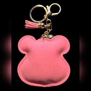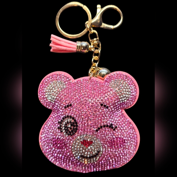 Cute pink care bear keychain with sparkling rhinestones. Features a tassel and clip for easy attachment for keys, purse or backpack.
