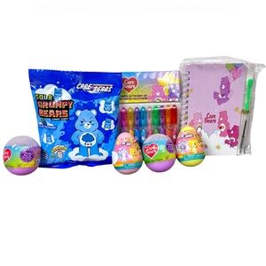 Fun Care Bears Bundle. Comes with Grumpy Bear gummy candy ( new from Miniso), 10 pack of mini glitter body art pens, notebook w pen, 2 blind balls & 2 blind eggs! Perfect for an Easter basket!