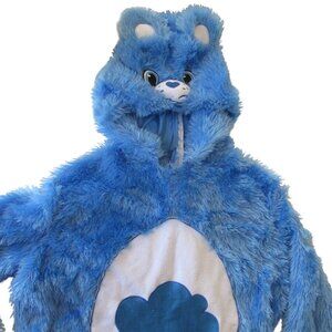 Grumpy Bear one-piece costume features soft fluffy 'fur," an attached hood, back zip and the Care Bears logo. Bright blue. Size tag is missing, please refer to measurements below: