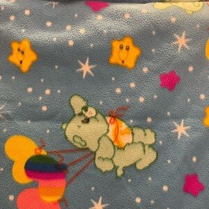 Care Bears handmade bedspread, blue with Wish bear, plaid on the other side. My mother in law made this for our daughter who is now 24 I saved it hoping she would want it for her kids.. she doesn’t unfortunately :(. I also have a Dora the Explorer available in the closet same situation.