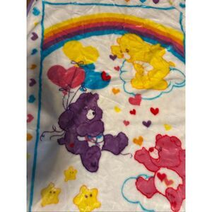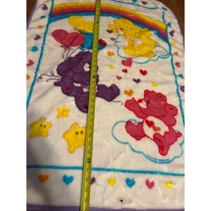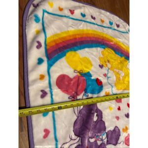 Care bear Rainbows Hearts Bears Ballons fleece blanket 41x28". purple, yellow, pink bears. good used condition .