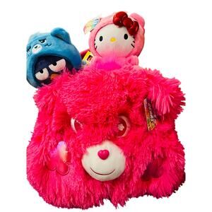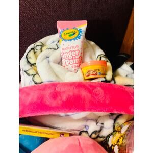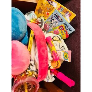 Care-bear pink giant Easter basket 13 inches wide by 14 inches high includes pink, Carebear, Tumblr, erasers ,book stickers, hello kitty dressed as cheer bear and grumpy bear, peeps crayons, Play-Doh, pink, peeps, chalk, bathtub, finger paint, pink bubble wand, and one pair of socks and a 60 x 90 adorable soft Carebear throw.All items are new and ready to ship , Can add to bundle . Thank you !
