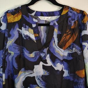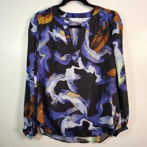 Nine West Blue Watercolor Split Neck Long Sleeve