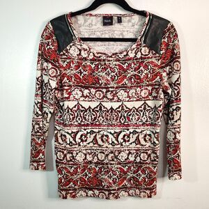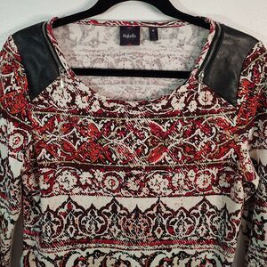 Rafaella Red Pattern 3/4 Sleeve with faux leather trim and zipper accents on shoulders