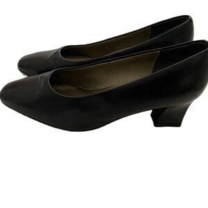 Step out in timeless elegance with these Caressa East genuine leather women's pump heels. Featuring a sophisticated wide heel & a stylish square toe design, these pumps offer both comfort & fashion-forward appeal. The black color complements a variety of outfits, making them a versatile addition to any wardrobe. Perfect for work, special occasions, or everyday chic styling. Size 7 ½” W. Heel Size: Height is 2 ½”; Width: 1”; Depth: 1 ¼”. Condition is ‘Pre-owned’.