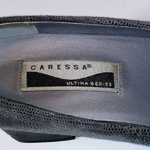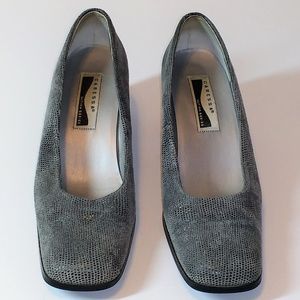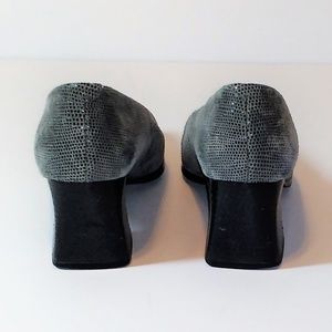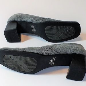 Are you in the market for a vintage pair of quality workhorse shoes? If so, you want to look at these Caressa gray leather 2 1/4" block heel pumps available in size 7 1/2 M. The name suggests comfort as in caressing your feet while the outer sole is made of rubber/textured rubber to keep you grounded. The gray leather shines with a glossy finish. In good condition, but with creased leather and signs of wear on the interior of the shoes, heels and outer soles. 👄