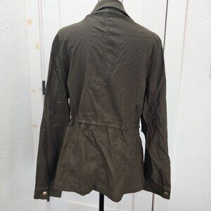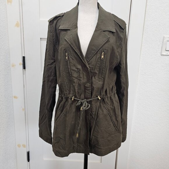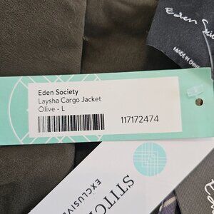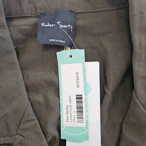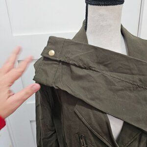 Olive Color, Eden Society Cargo Jacket, Tie Waist for Slimming Look, New With Tags, Never Worn, Can be worn as a statement/cover up or as a light spring/summer jacket