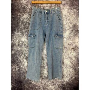 The product is a pair of women's cargo jeans in size small, featuring a grunge, hip hop, and skate-inspired design with a wide-leg fit. Made of a denim fabric blend with a high rise and cargo pockets, these jeans are ideal for the winter, summer, fall, and spring seasons. The blue color and solid pattern add to the retro and 90s vibe, making them a comfortable and versatile option for everyday wear. The brand SheIn offers a regular fit and includes features such as stretch and multiple pockets for added convenience.