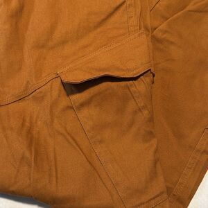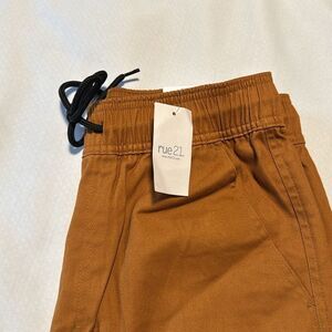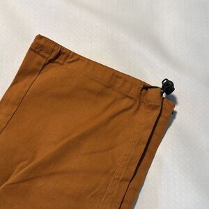 This is new with tags. The color is brown. The fabric content is 98% polyester, 2% spandex. The length from top to bottom is 41 inches. 30 inch inseam. The waist is 30 inches stretches to about 38 inches, can be made smaller with the outer drawstring. Side cargo pockets. Two side pockets, one rear pocket. The leg opening is 16 inches measured around. Drawcord adjust leg opening.