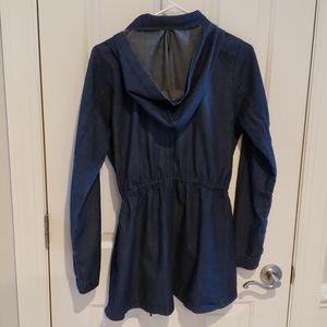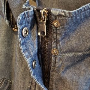 Denim cargo jacket wit 4 pockets. Zip and snap closure. Removable hood. Light weight
