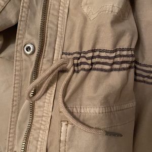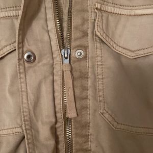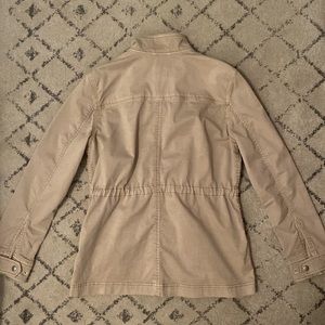Spring jacket with cinched waist. Four pockets. Khaki color. Zipper and button closure. Great condition, smoke free and pet free home.