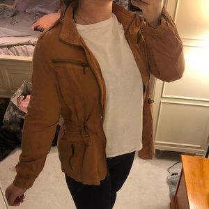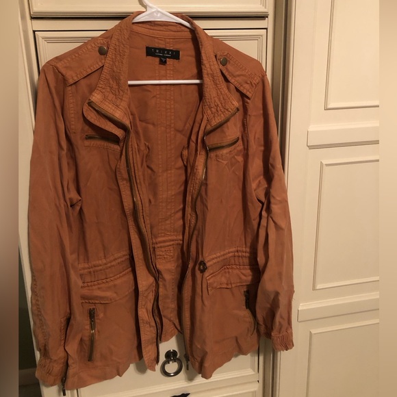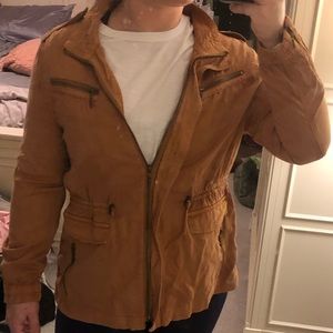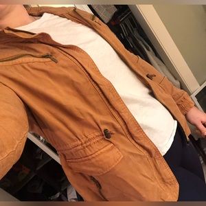 Size large, rustic orange, light and comfy cargo jacket with zipper, pockets with buttons and adjustable waist tie.