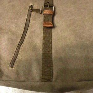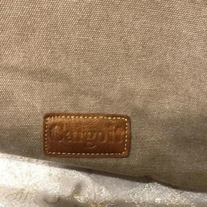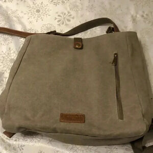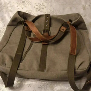 CargoIT stonewashed canvas with leather handle shoulder bag/backpack. Zippered compartments on front and back. Snap shut did Bain closure. Inside has two compartments separate by one zippered pouch. There is one open side compartment and one zippered side pocket. Measurements are 16” wide x 13” in height when laying flat. Strap drop is 11”when being used as a shoulder bag.