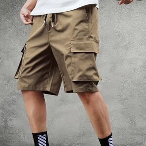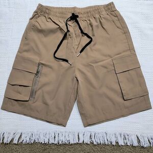 These brand new size Medium cargo khaki multi-pocket shorts are perfect for anyone looking for a comfortable and stylish bottom wear. With several pockets, they are highly convenient for carrying your essentials. Each cargo pocket features a different style. These shorts consist of a drawstring elastic waistband. The shorts are unisex, making them ideal for both men and women. Features a high quality silk fabric polyester material that is very lightweight, breathable, anti static and wicks away moisture. Perfect for very hot climates