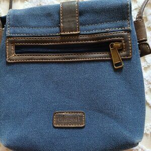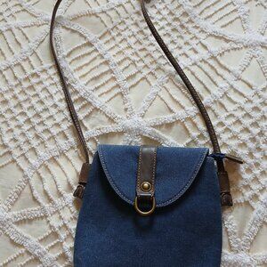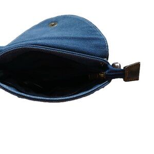 Denim bag with leather and brass accents. One interior zip pocket and two non-zip pockets, one exterior zip pocket. 7.5" x 7" x 2". Strap is 27" long.