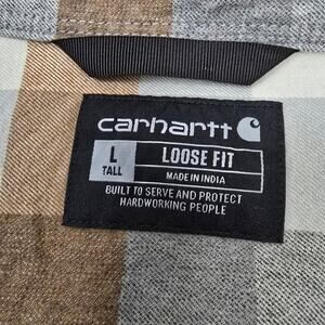 Carhart Loose Fit Brown Gray Plaid Flannel Outdoors Camp Workwear Rugged Logo L