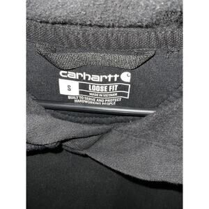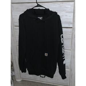 Get ready for anything with this durable Carhartt hooded sweatshirt! This is a size small tall in a stylish black color. Perfect for outdoor work or casual wear, this heavy-weight sweatshirt is built to last. The Carhartt logo is proudly displayed on the sleeve.
