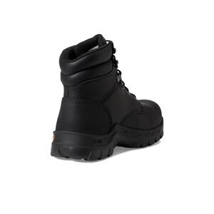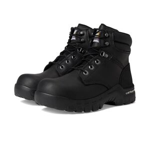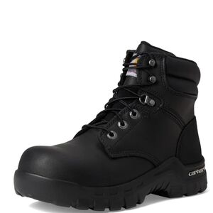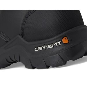 These Carhartt boots boast a sleek black composite toe offering a robust and professional appearance. Designed with a high-top silhouette and a padded ankle collar, they ensure comfort and support for demanding work environments. The rugged rubber outsole provides excellent traction, making them a reliable choice for safety and durability.