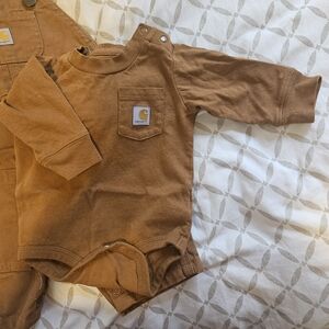 Adorable Carhartt baby set featuring classic brown overalls and a matching onesie. Includes a cream beanie with logo. 0-3 months, please comment any questions!
