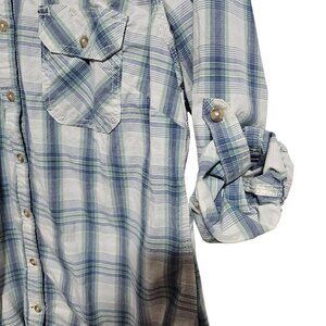 Carhartt Button Up Shirt Womens Size Large Blue White Plaid Roll-Tab Sleeves