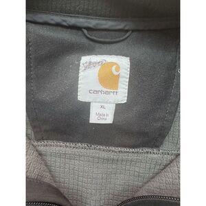 This is a Carhartt Canvas Jacket in size XL for men, designed in a classic black color. The jacket features a soft shell construction with a polyester outer shell material, making it rain resistant and ideal for work or outdoor activities. It is a regular fit jacket with a durable fabric type that provides both style and functionality. Perfect for individuals looking for a reliable and high-quality coat to stay comfortable and protected in various weather conditions.