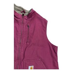Carhartt Canvas Vest Women Size XL Sherpa Lined Full Zip Mauve Pink Berry WV001648. This vest is in good condition. It has two front pockets and full zip closure. Please see photos for best description and details.